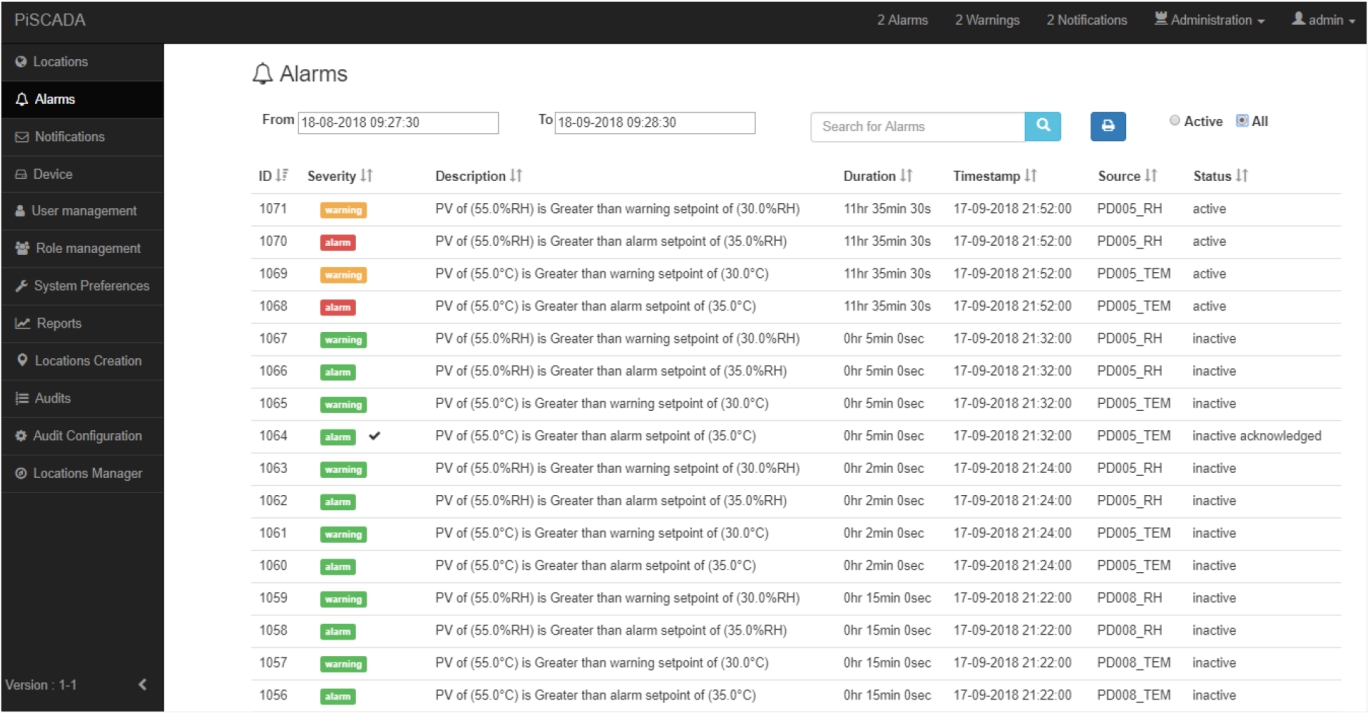 PiSCADA is the latest offering from Polmon in Critical Process Parameter monitoring and logging. PiSCADA securely logs the data from proprietary as well as third party data loggers, stores in the inbuilt historian, and makes the data available over the web. Comprehensive Alarm Management and Audit Trails allow GxP events to be captured and reviewed by exception.