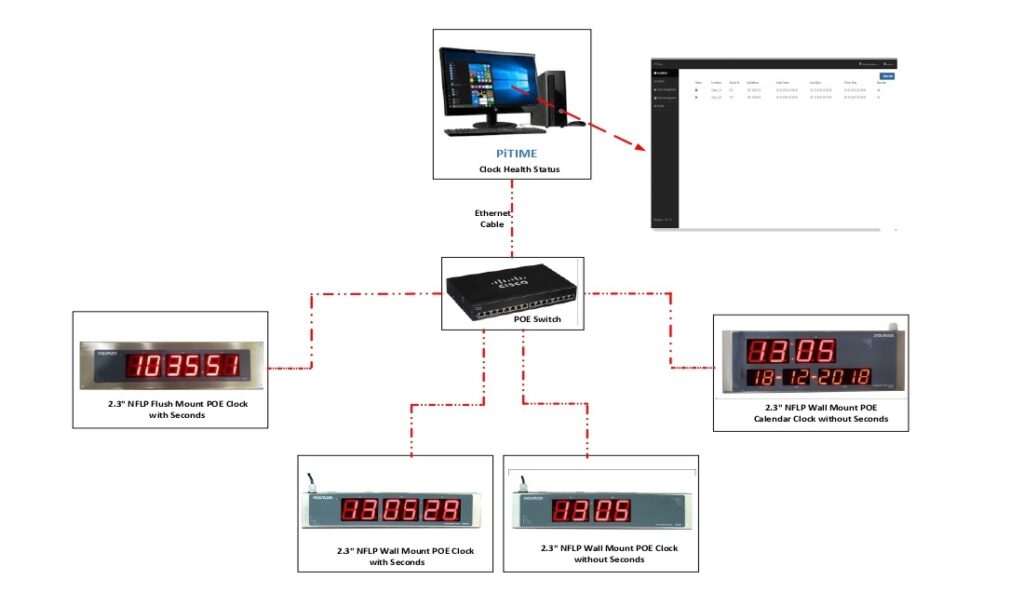 The POLMON POE Synchronized Digital Clock is a perfect solution for a wide range of applications where accurate, synchronized time is required. All clocks display the same real time whether in the office, factory, warehouse or canteen.